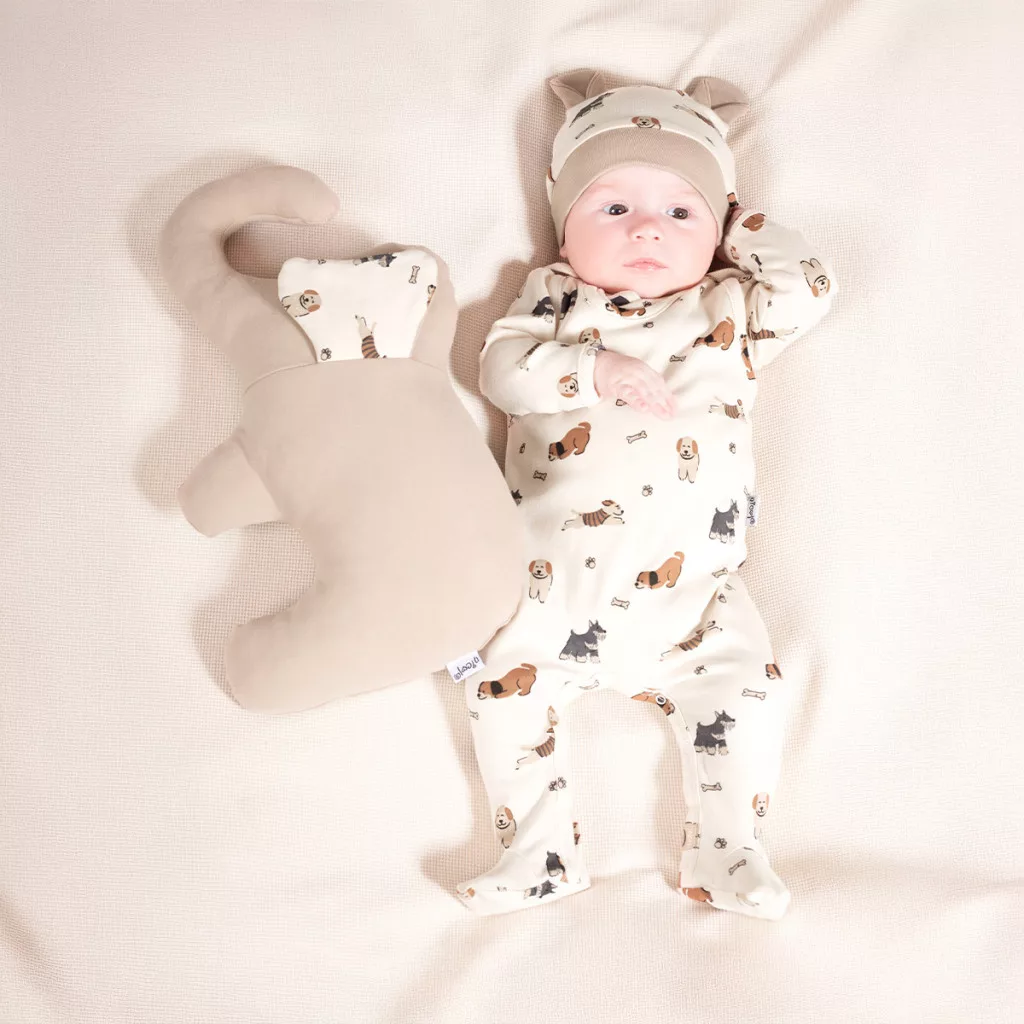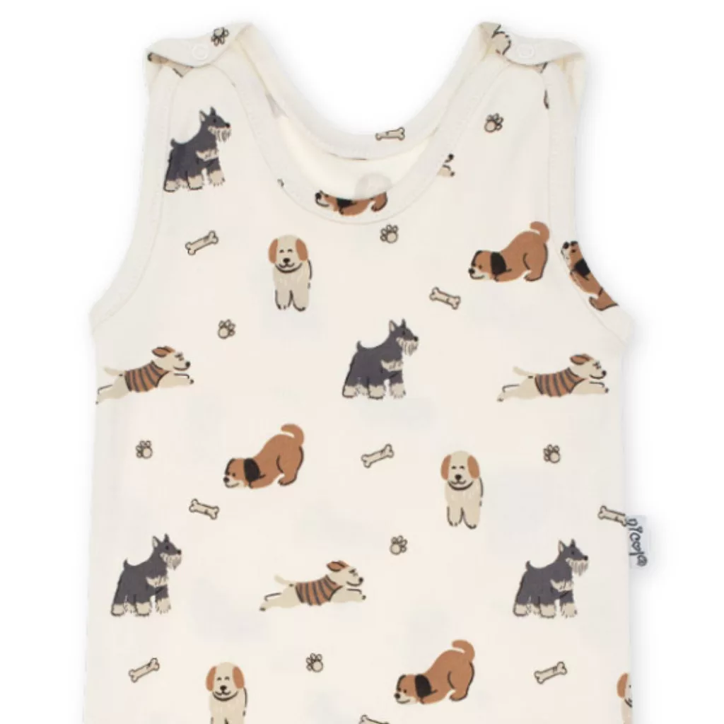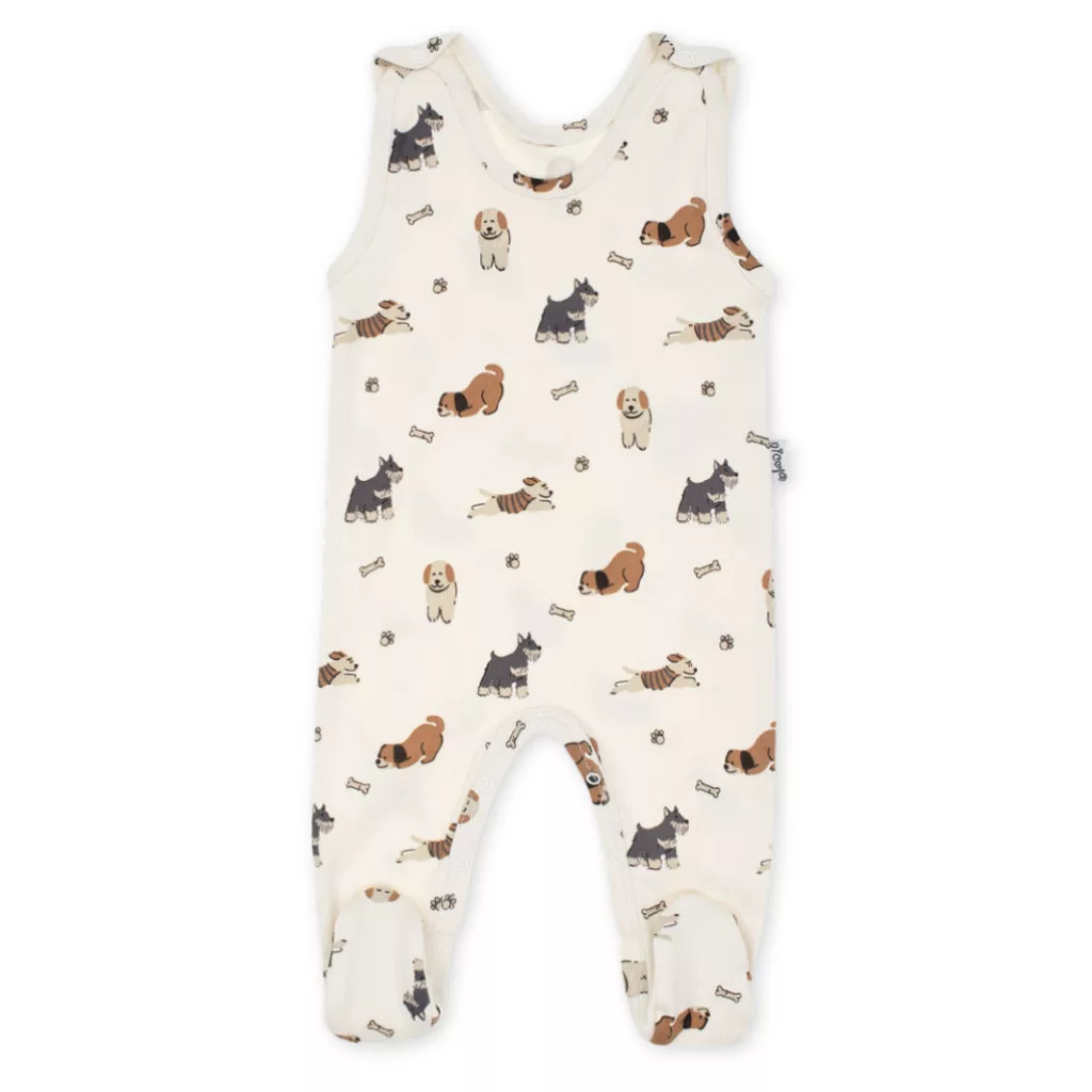 Kényelmes ujjatlan rugdalózó az Eddy kollekcióból – krémszínű, puha pamutból, vidám kutyamintával. A nikkelmentes patenttal rögzített vállpántok gondoskodnak arról, hogy a rugdalózó ne csússzon le. Az ágyékrészen található patentok megkönnyítik a pelenkacserét. Az anyag minőségét az Oeko-Tex Standard 100 – Trustworthy Textiles tanúsítvány garantálja.