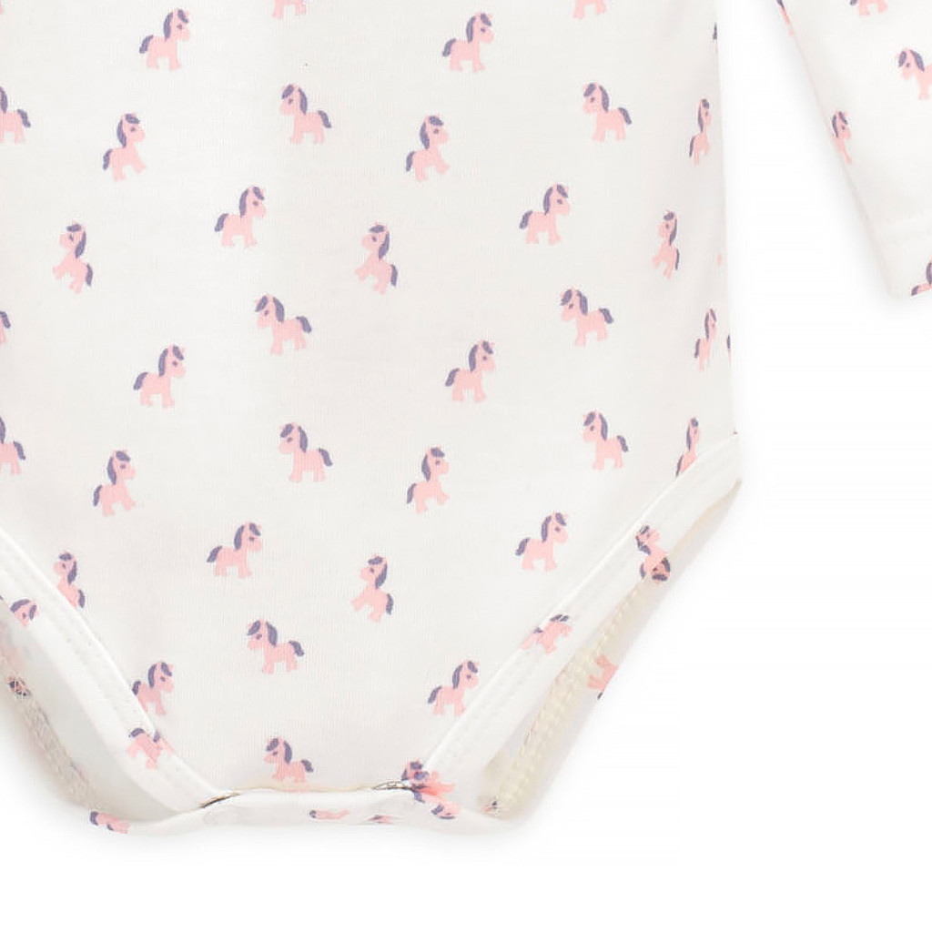 Ez a body tökéletes alapdarab lehet a kisgyermek ruhatárában, könnyen kombinálható más ruhadarabokkal, legyen szó nadrágról, szoknyáról vagy pulóverről. A póni minta vidámságot csempész a mindennapokba, így az öltözék mindig mosolyt csal majd az arcokra.