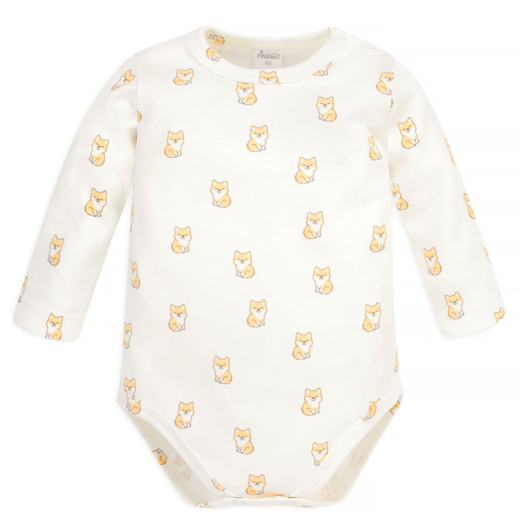 Hosszú ujjú, bal vállon és lábak között patentolható pamut body, aranyos kutya mintával, prémium minőségű, tartós, vegyszer- és allergénmentes, 100% pamut anyagból.