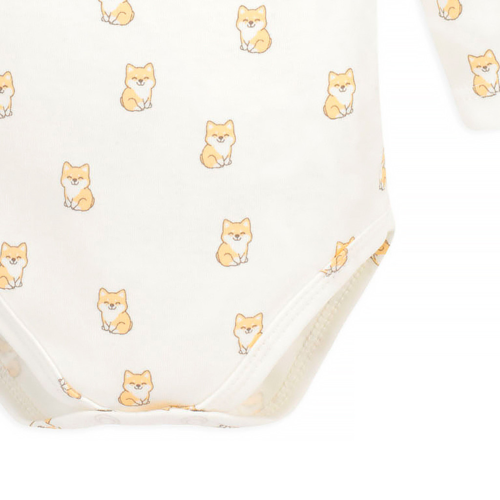 Hosszú ujjú, bal vállon és lábak között patentolható pamut body, aranyos kutya mintával, prémium minőségű, tartós, vegyszer- és allergénmentes, 100% pamut anyagból.