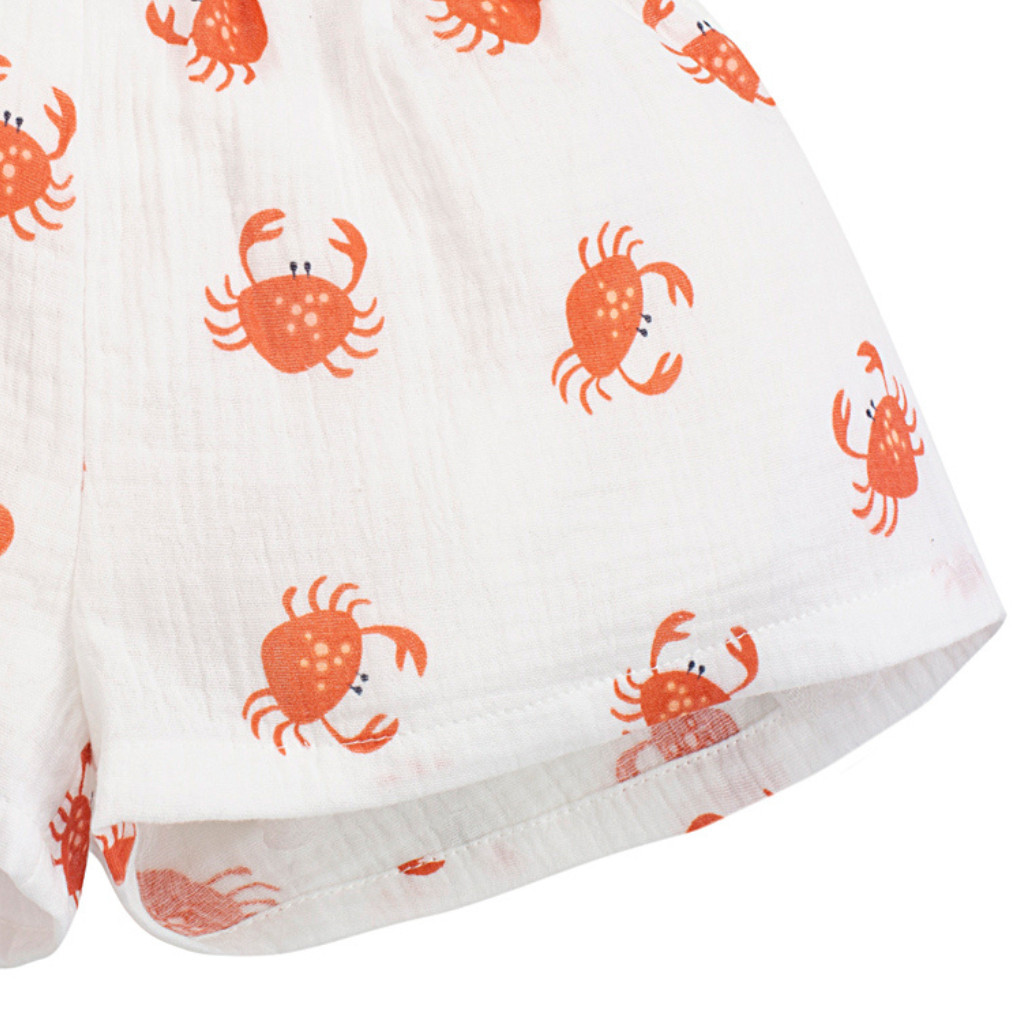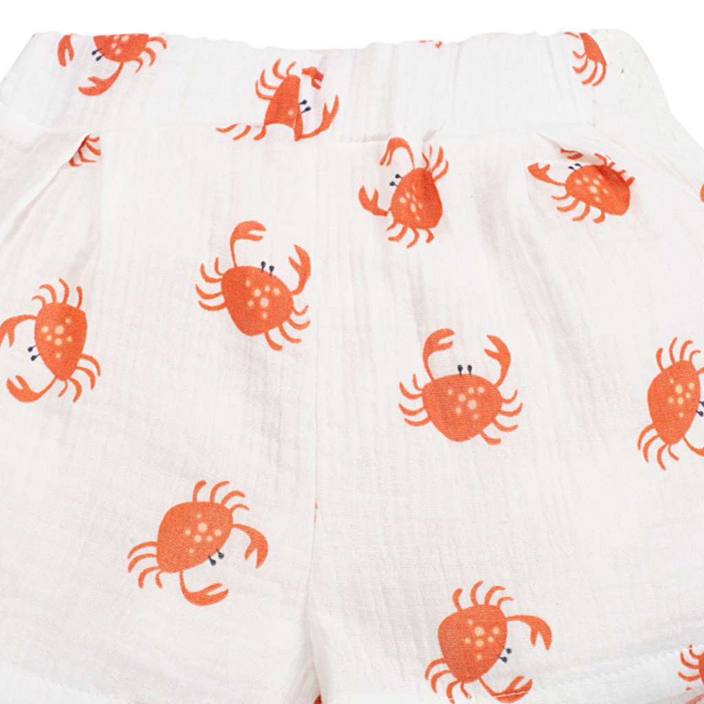Kiváló minőségű, 100% pamut anyagból készült muszlin rövidnadrág aranyos rákocska mintával. Tökéletes választás a forró nyári napokra, nyaralásra, születésnapra, fotózásra, alkalmakra.