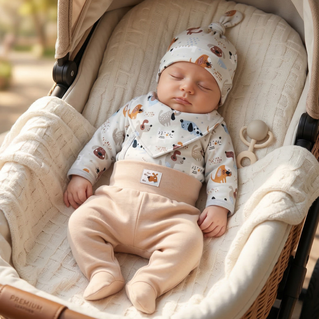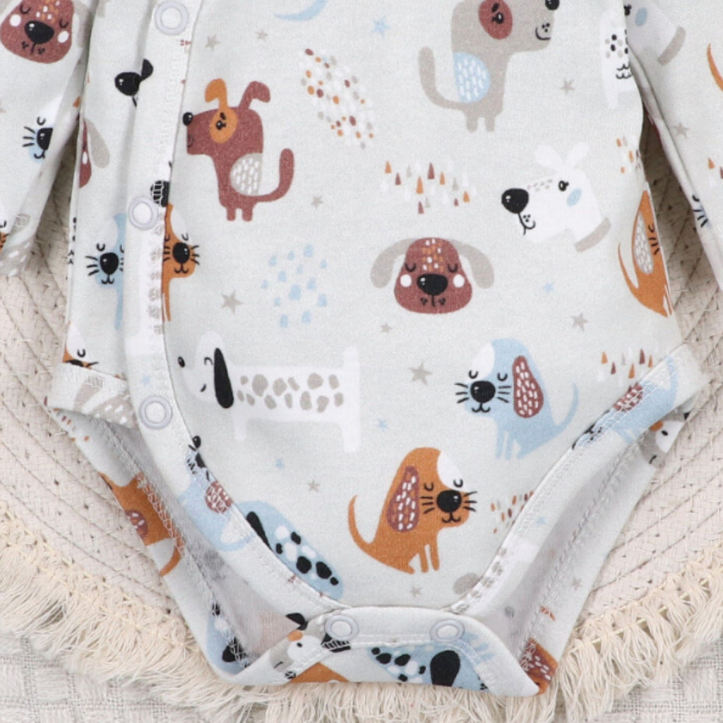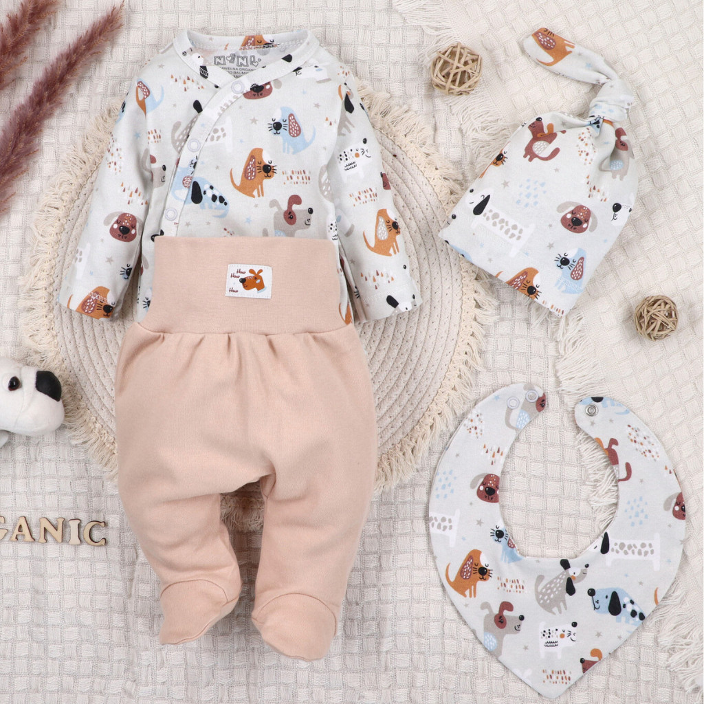 A Nini Dogs kollekció négyrészes baba együttese ideális választás újszülöttek és kisbabák számára. A szett tartalmaz egy átlapolós bodyt, kényelmes nadrágot, sapkát és nyálkendőt, így egy teljes, összehangolt öltözéket kapsz egyben.