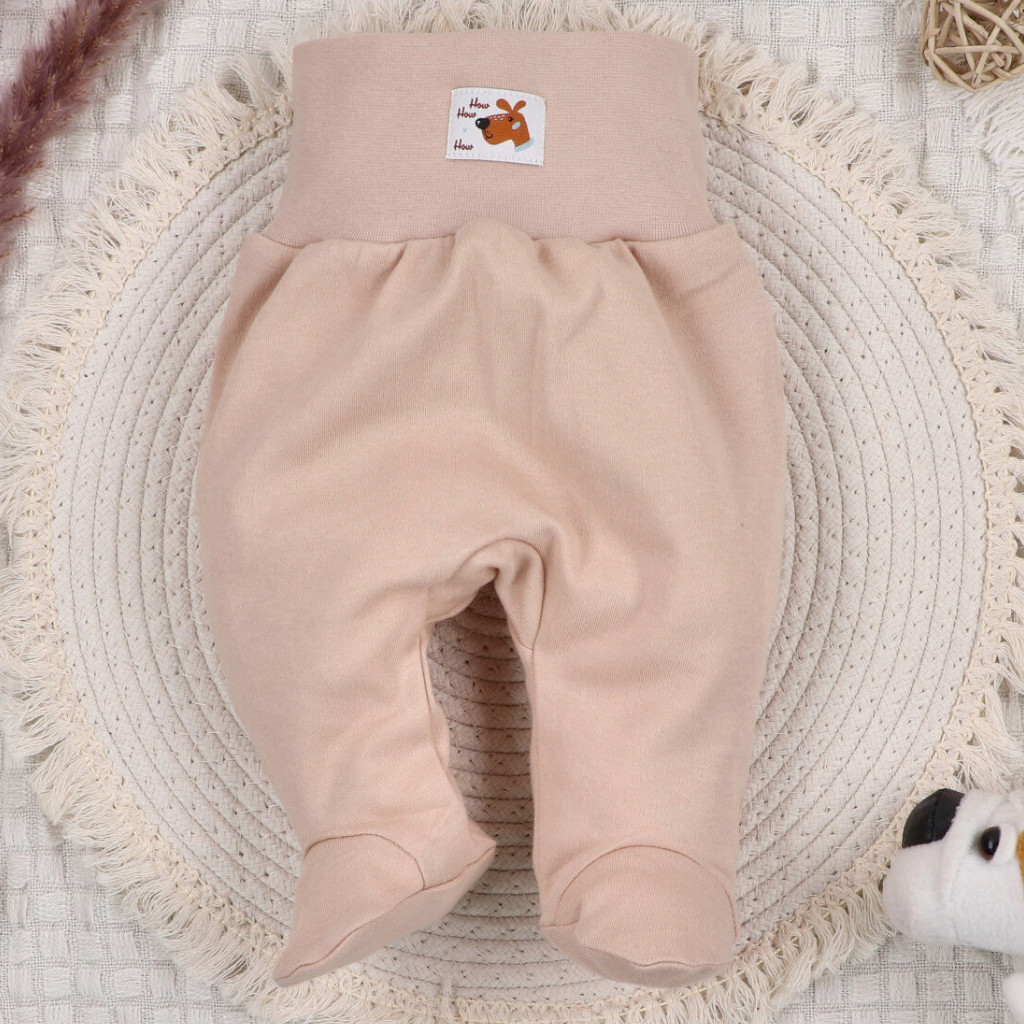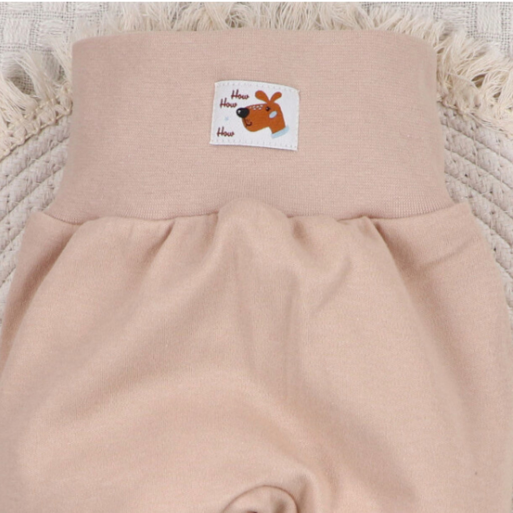 A nadrág széles, magasított derékrésszel készült, amely finoman körbeöleli a baba pocakját. Ez a kialakítás különösen kényelmes fekvő és mozgó helyzetben is, nem csúszik le, és nem szorít.
