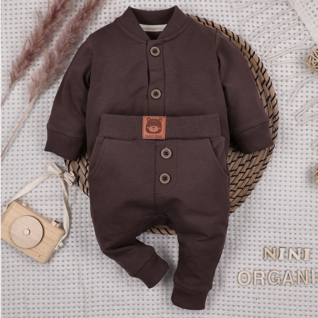 A nadrág 95% organikus pamut és 5% elasztán felhasználásával készült. Az organikus pamut természetes módon termesztett alapanyag, amely nem tartalmaz mesterséges műtrágyákat vagy vegyszereket, így kíméletes a bababőrhöz.