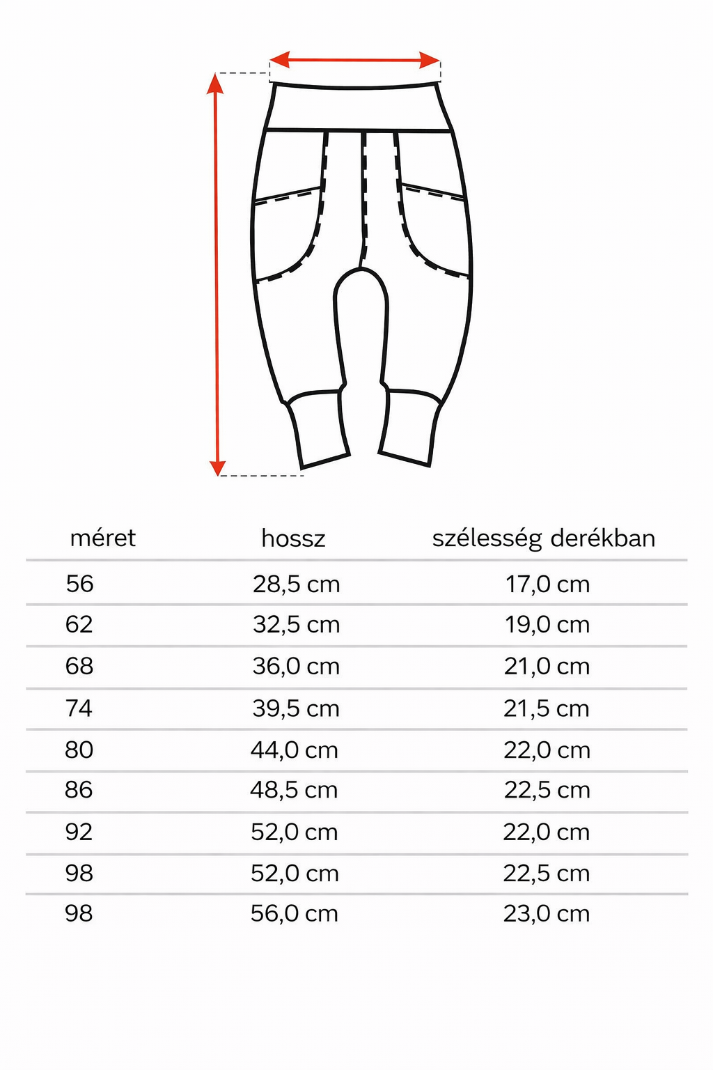 A baba nadrág egész évben használható, bodyval vagy pólóval kombinálva különösen kényelmes.