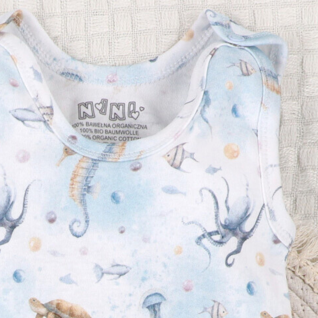 A nikkelmentes patentok gyors és egyszerű pelenkacserét tesznek lehetővé, miközben biztonságosak az egészségre. A bevasalt címke nem irritálja a bőrt, így a rugdalózó még komfortosabb viselet. A termék lengyel alapanyagból készült, és Lengyelországban gyártották, gondos minőségellenőrzés mellett.