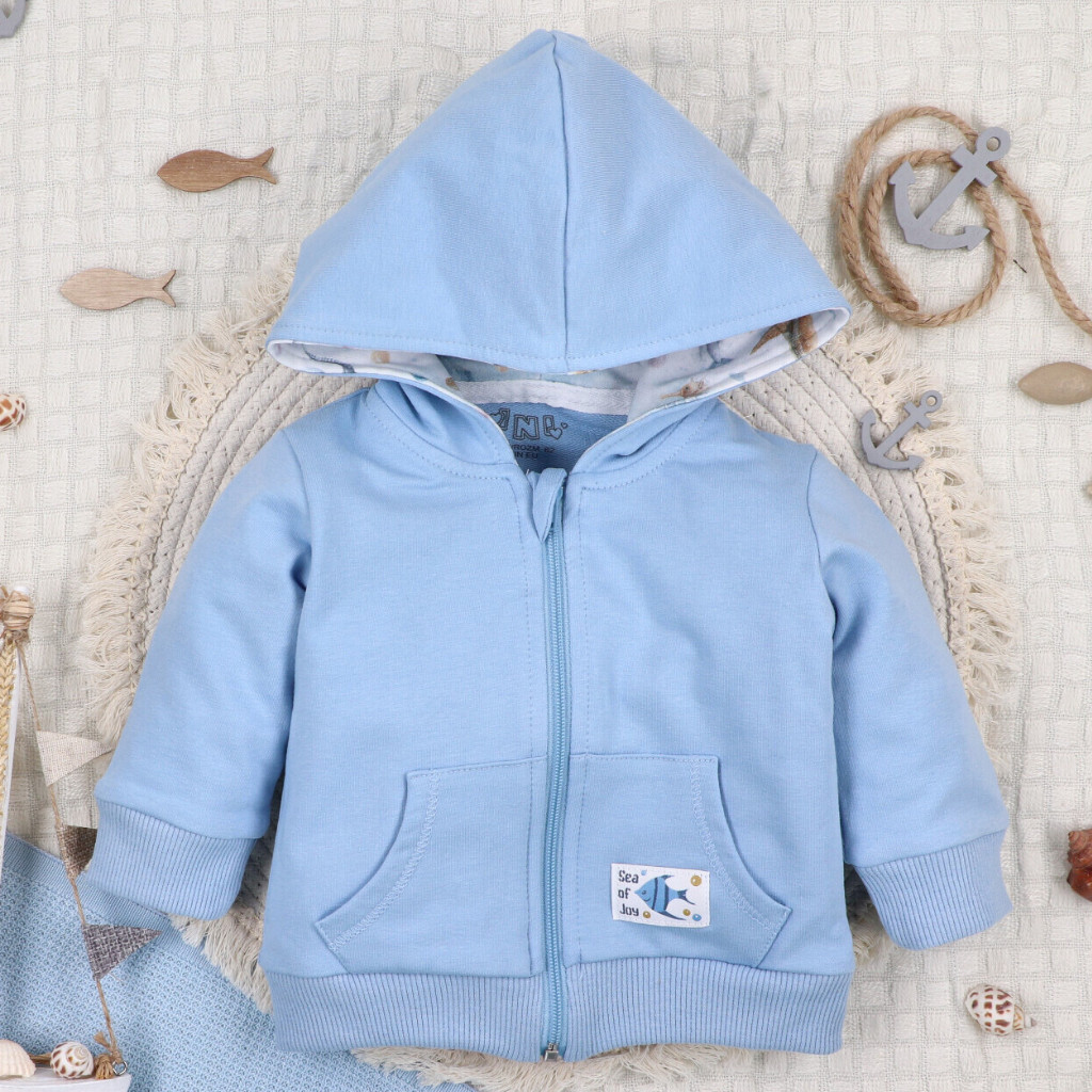 Ez a Sea of Joy cipzáras, kapucnis pulóver kényelmes és praktikus választás sétához, játszótérre vagy bölcsibe. A cipzáras kialakítás megkönnyíti az öltöztetést, a kapucni pedig jól jön hűvösebb időben. A termék 56–86-os méretben érhető el.