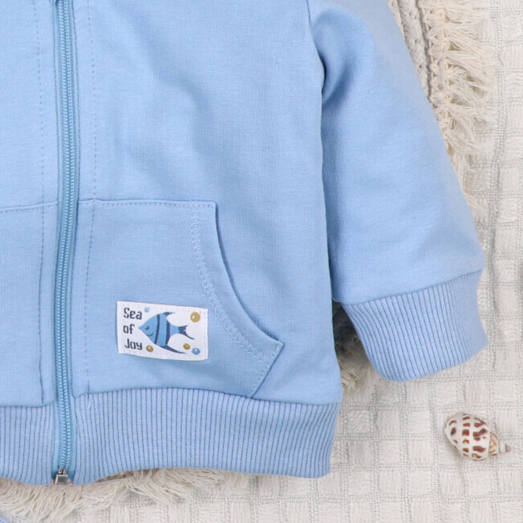 Ez a Sea of Joy cipzáras, kapucnis pulóver kényelmes és praktikus választás sétához, játszótérre vagy bölcsibe. A cipzáras kialakítás megkönnyíti az öltöztetést, a kapucni pedig jól jön hűvösebb időben. A termék 56–86-os méretben érhető el.