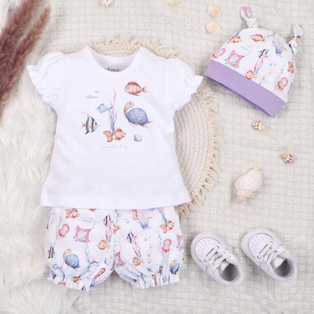 A NINI Underwater World baba rövidnadrág tökéletes választás a melegebb napokra. A vidám tengeri minták és a 100% organikus pamut kombinációja egyszerre biztosít kényelmet, légáteresztést és természetes puhaságot a babák számára.
