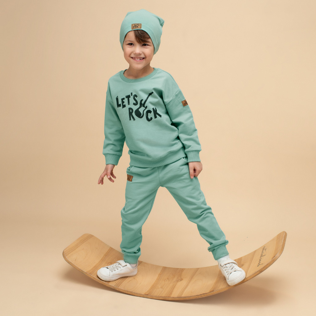 Ez a mentazöld kisfiú háromrészes együttes tökéletes választás aktív hétköznapokra. A pulóver, nadrág és sapka harmonikus kombinációja sportos, modern megjelenést biztosít, miközben maximális kényelmet nyújt játék, séta vagy óvodai programok során. A „Let’s Rock” mintával díszített pulóver vidám, karakteres stílust ad az összeállításnak.