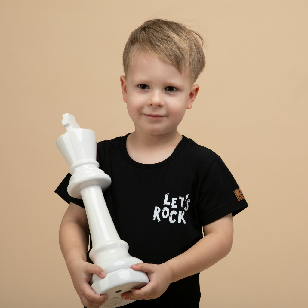 Ez a fekete kisfiú kétrészes együttes ideális választás a mindennapi viselethez. A „Let’s Rock” feliratos rövid ujjú póló és a kényelmes leggings sportos, modern megjelenést biztosít, miközben maximális komfortot nyújt játék, séta vagy óvodai programok során.