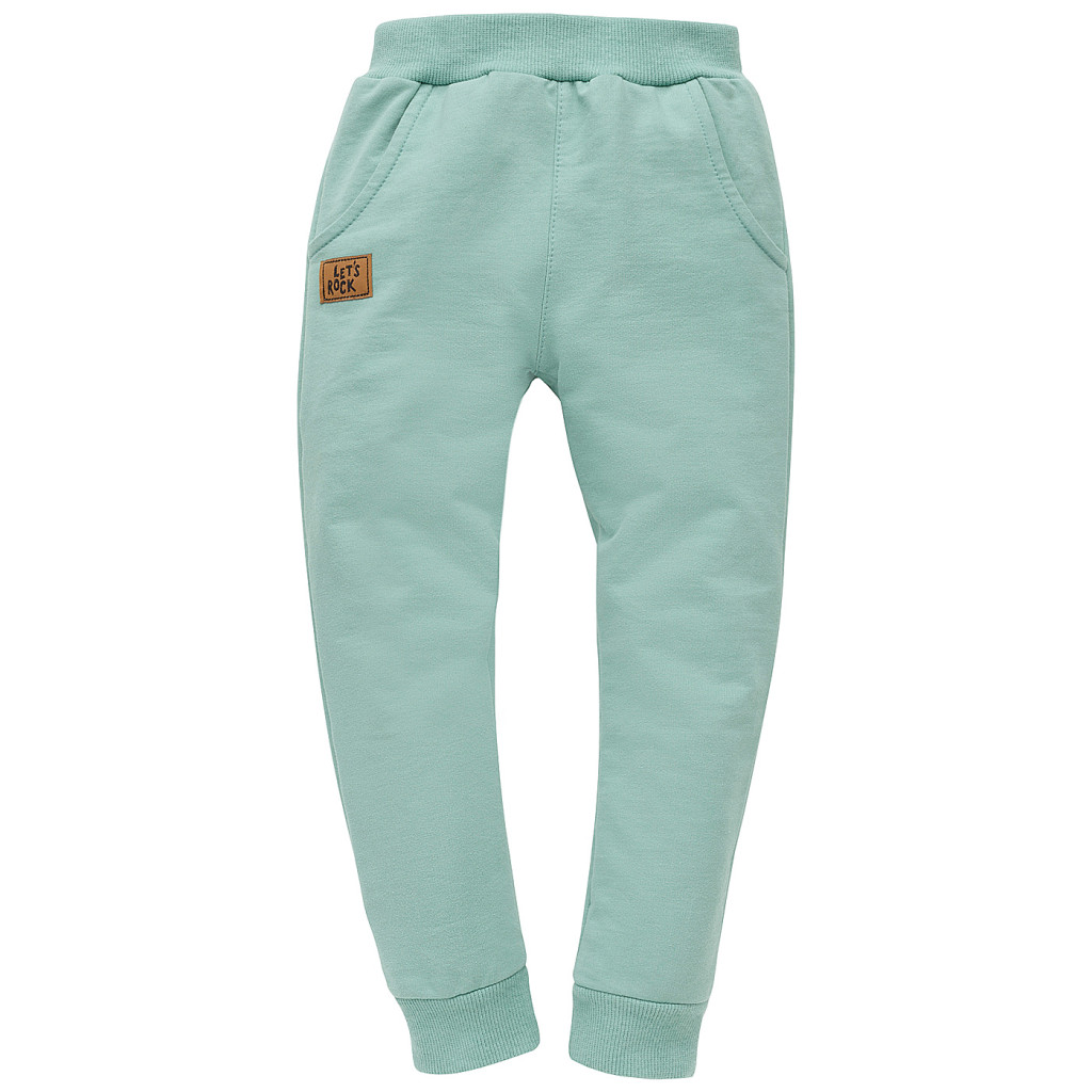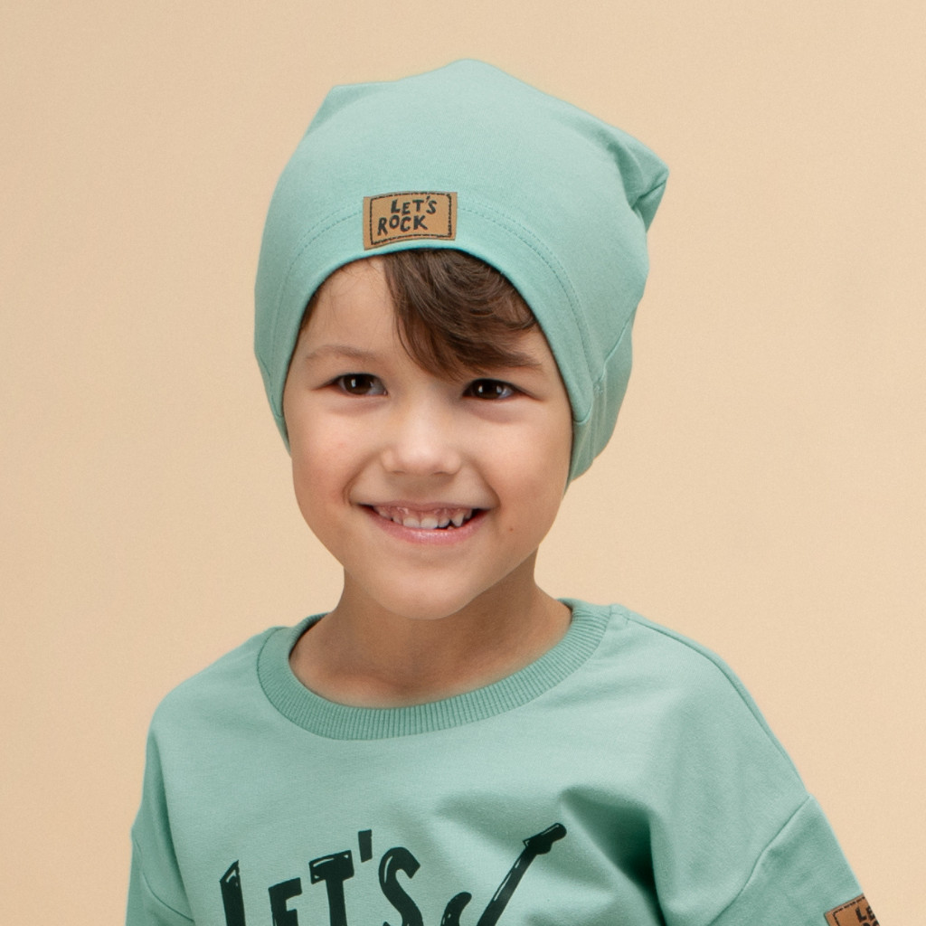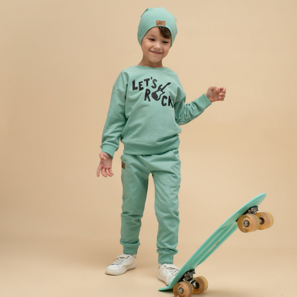 Ez a mentazöld kisfiú háromrészes együttes tökéletes választás aktív hétköznapokra. A pulóver, nadrág és sapka harmonikus kombinációja sportos, modern megjelenést biztosít, miközben maximális kényelmet nyújt játék, séta vagy óvodai programok során. A „Let’s Rock” mintával díszített pulóver vidám, karakteres stílust ad az összeállításnak.