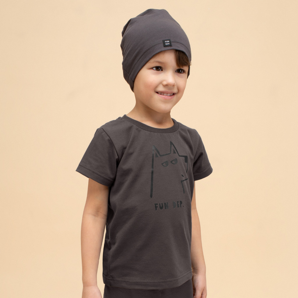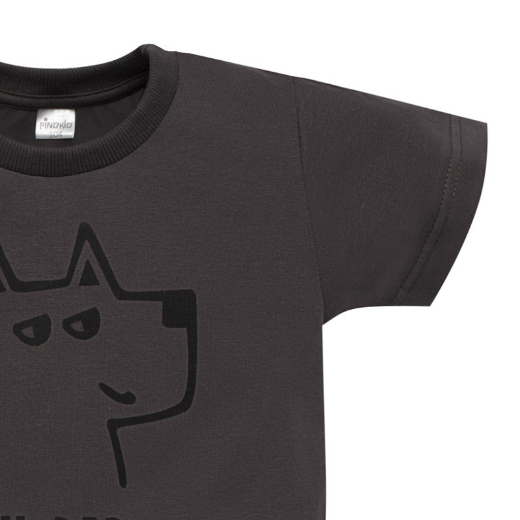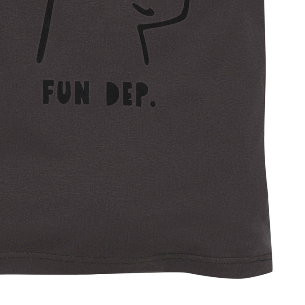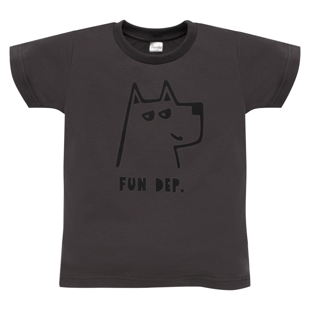 Ez a grafitszürke kisfiú póló egyszerre kényelmes és stílusos választás a mindennapokra. A mellrészen látható minimalista kutyás minta és a „Fun Dep.” felirat játékos, mégis modern megjelenést ad. A 95% pamut és 5% elasztán összetételű anyag puha tapintású, rugalmas és kíméletes a gyermekek bőréhez, így egész napos komfortot biztosít. A bordázott nyakkivágás jól illeszkedik, a kisebb méreteknél a vállrészen patent segíti az öltöztetést.