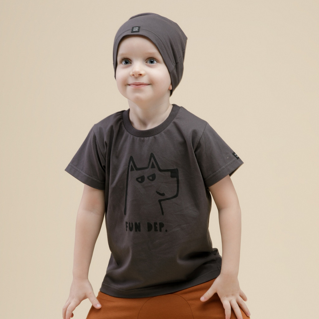 Ez a grafitszürke kisfiú póló egyszerre kényelmes és stílusos választás a mindennapokra. A mellrészen látható minimalista kutyás minta és a „Fun Dep.” felirat játékos, mégis modern megjelenést ad. A 95% pamut és 5% elasztán összetételű anyag puha tapintású, rugalmas és kíméletes a gyermekek bőréhez, így egész napos komfortot biztosít. A bordázott nyakkivágás jól illeszkedik, a kisebb méreteknél a vállrészen patent segíti az öltöztetést.