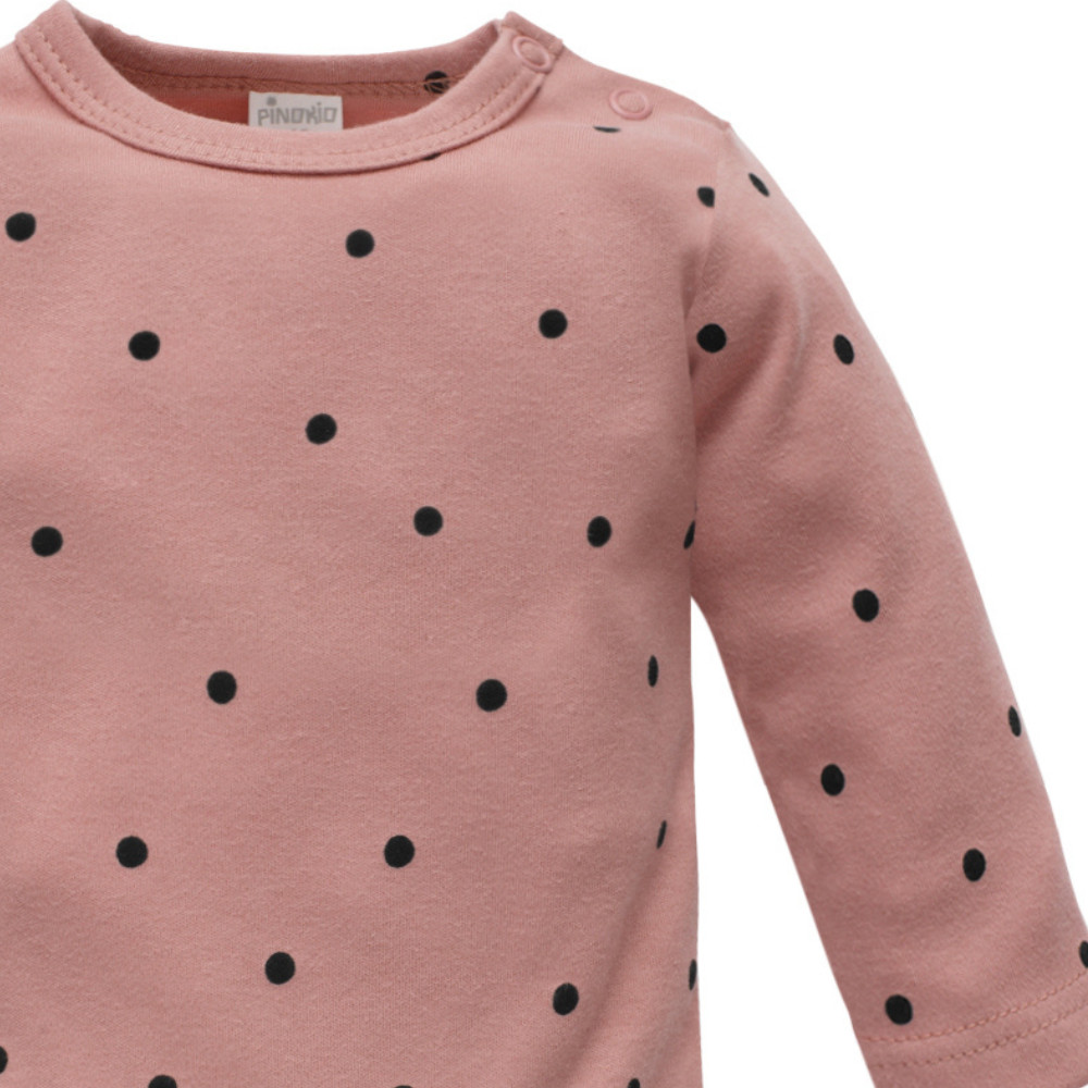 A pöttyös minta és a szolid rózsaszín színkombináció tökéletesen illeszkedik a kislányok ruhatárába, így ez a body stílusos választás bármilyen alkalomra, legyen az egy családi összejövetel vagy egy laza otthoni nap.