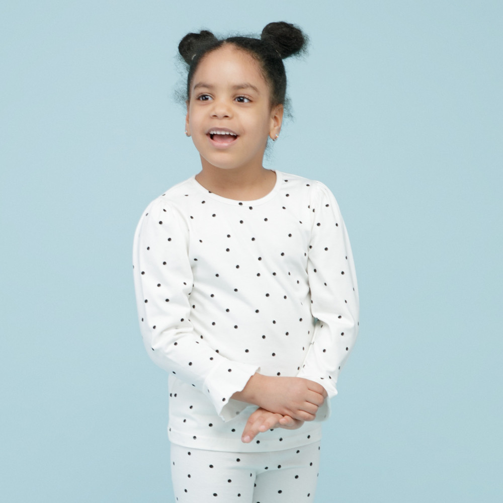 Szín: Ekrü pöttyökkel – finom és univerzális dizájn, amely könnyen illeszkedik minden gyerekruházathoz.