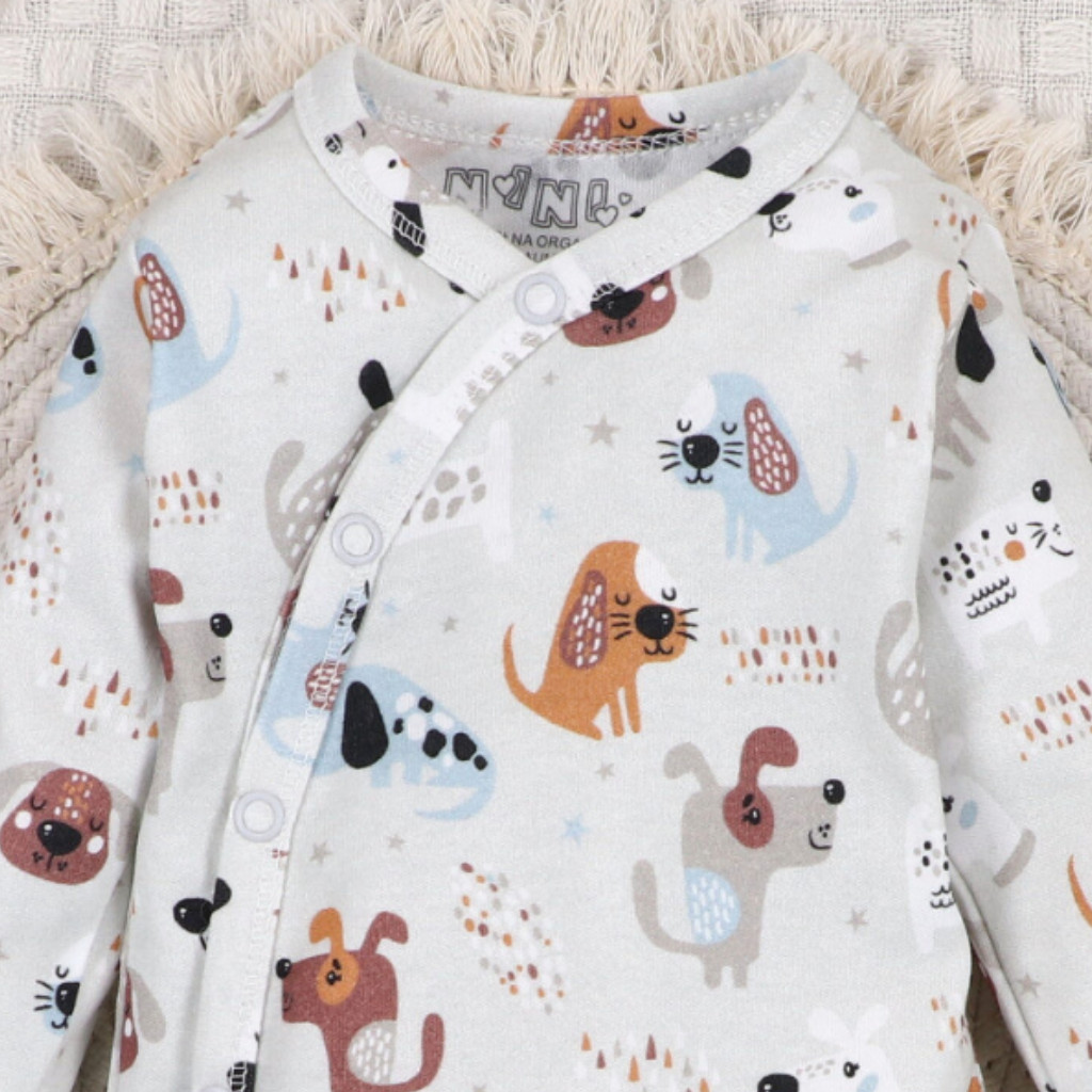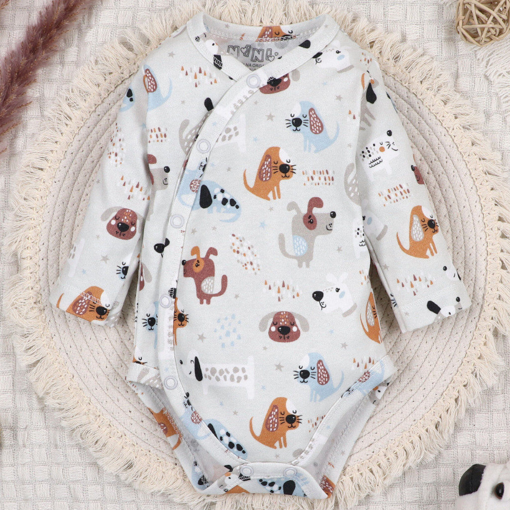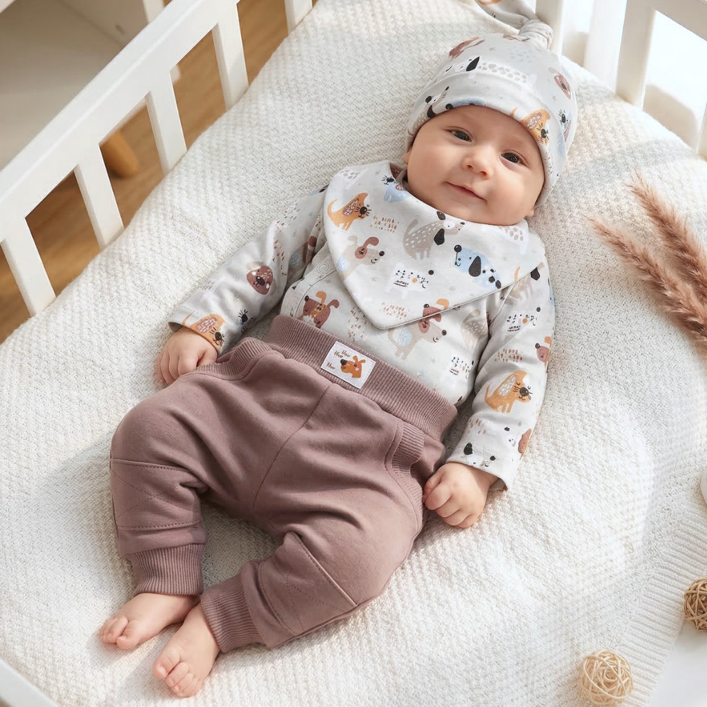 A Nini Dogs kollekció négyrészes baba együttese ideális választás újszülöttek és kisbabák számára. A szett tartalmaz egy átlapolós bodyt, kényelmes nadrágot, sapkát és nyálkendőt, így minden adott egy praktikus és összehangolt öltözékhez.