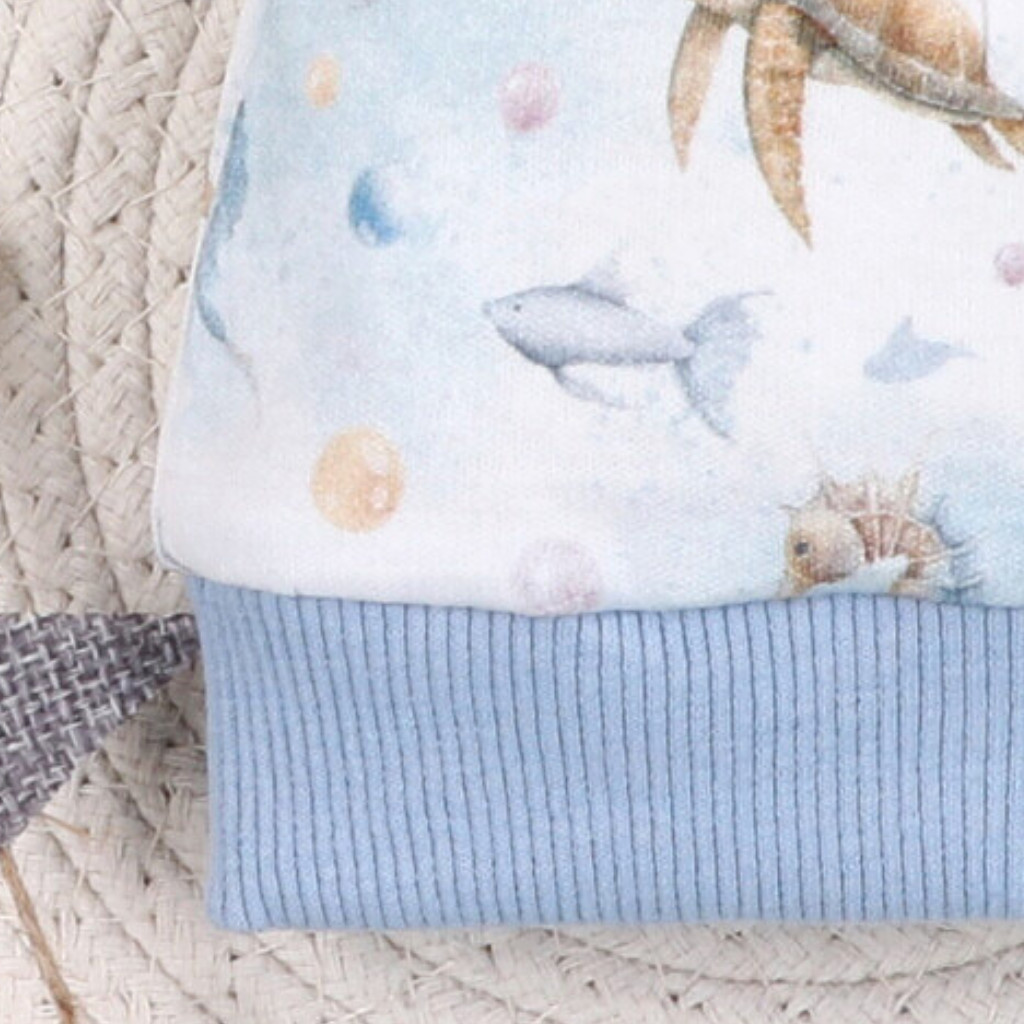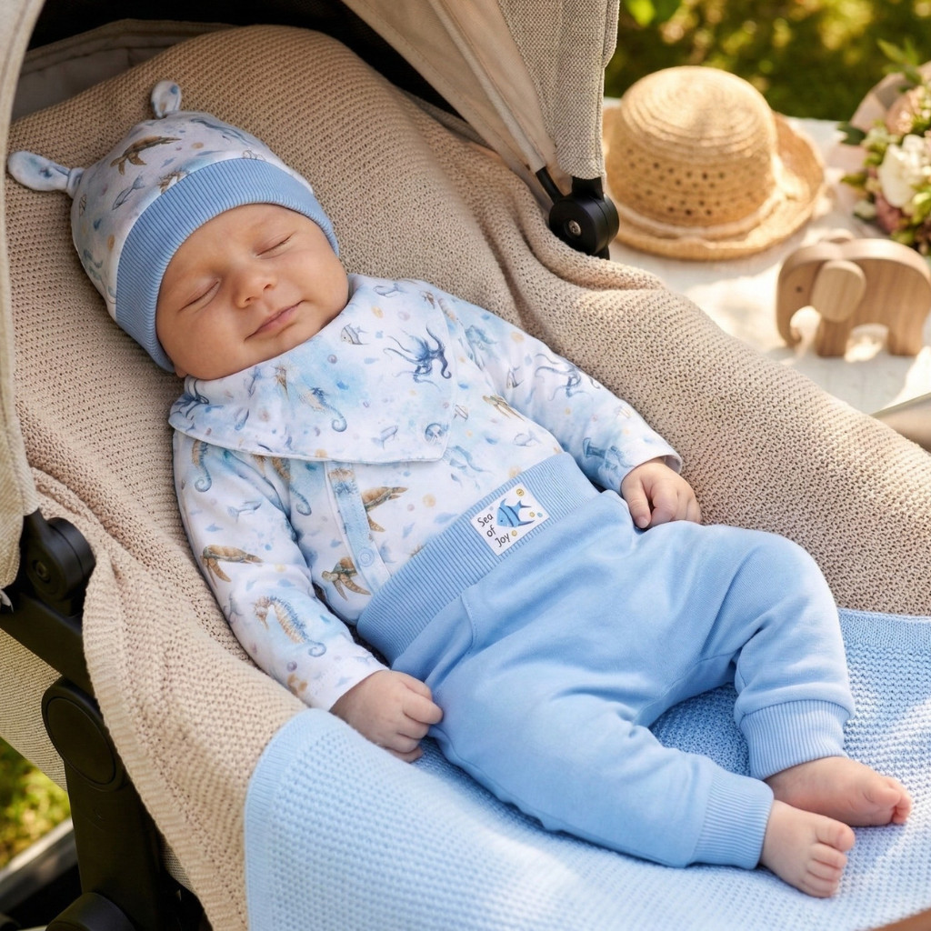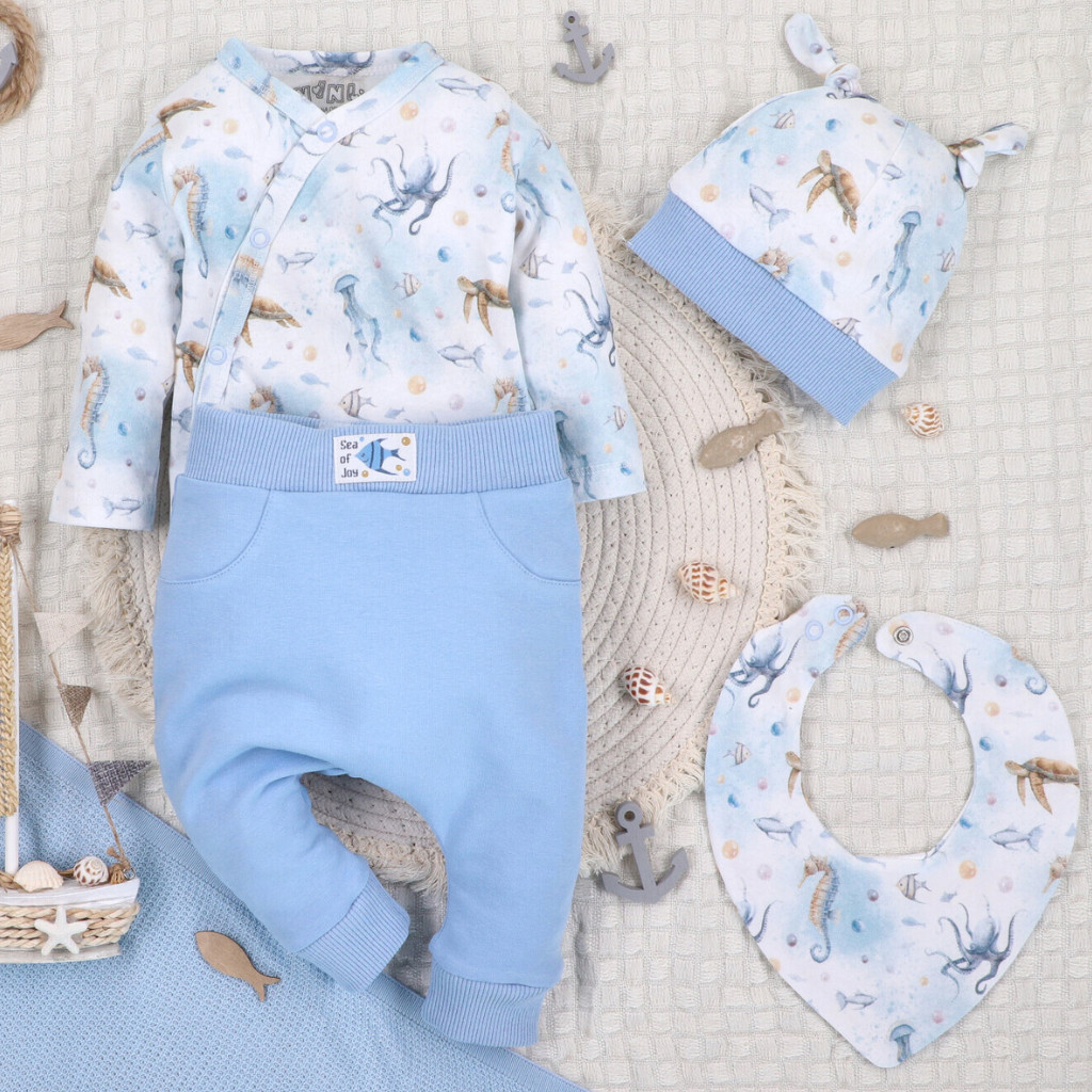 A Sea of Joy kollekció 4 részes babaruha együttese bodyból, nadrágból, sapkából és kendőből áll. Az összeállítás ideális mindennapi viseletként, hazahozós szettként vagy ajándékként is. A darabok harmonikusan kombinálhatók, kényelmesek és praktikusak.