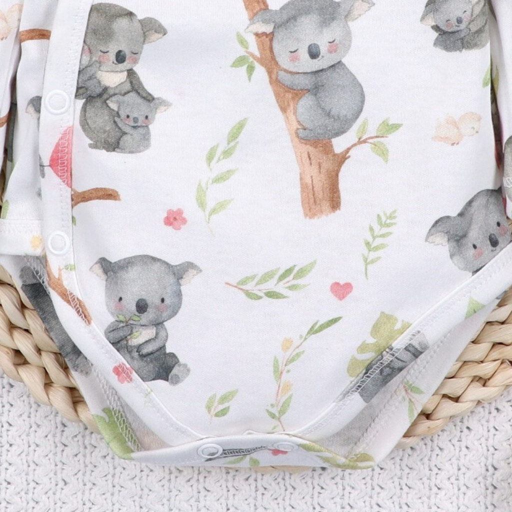 A Nini Koala kétrészes baba együttes kényelmes és praktikus választás a mindennapokra. A hosszú ujjú átlapolós body és a klasszikus derekú lábfejes nadrág együtt biztosítják a baba szabad mozgását. A 100% pamut anyag gyengéd a bőrhöz, a koalás minta pedig igazán szerethető megjelenést ad.