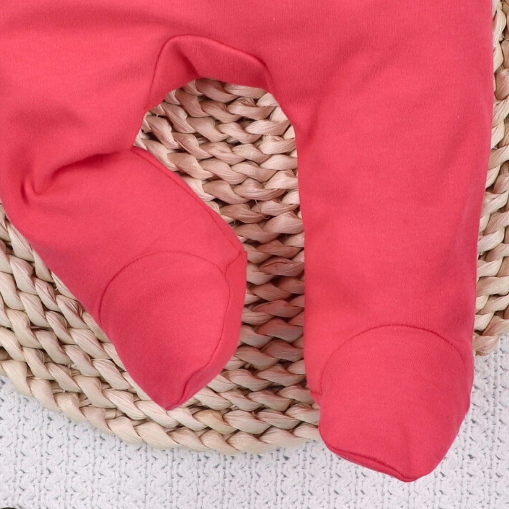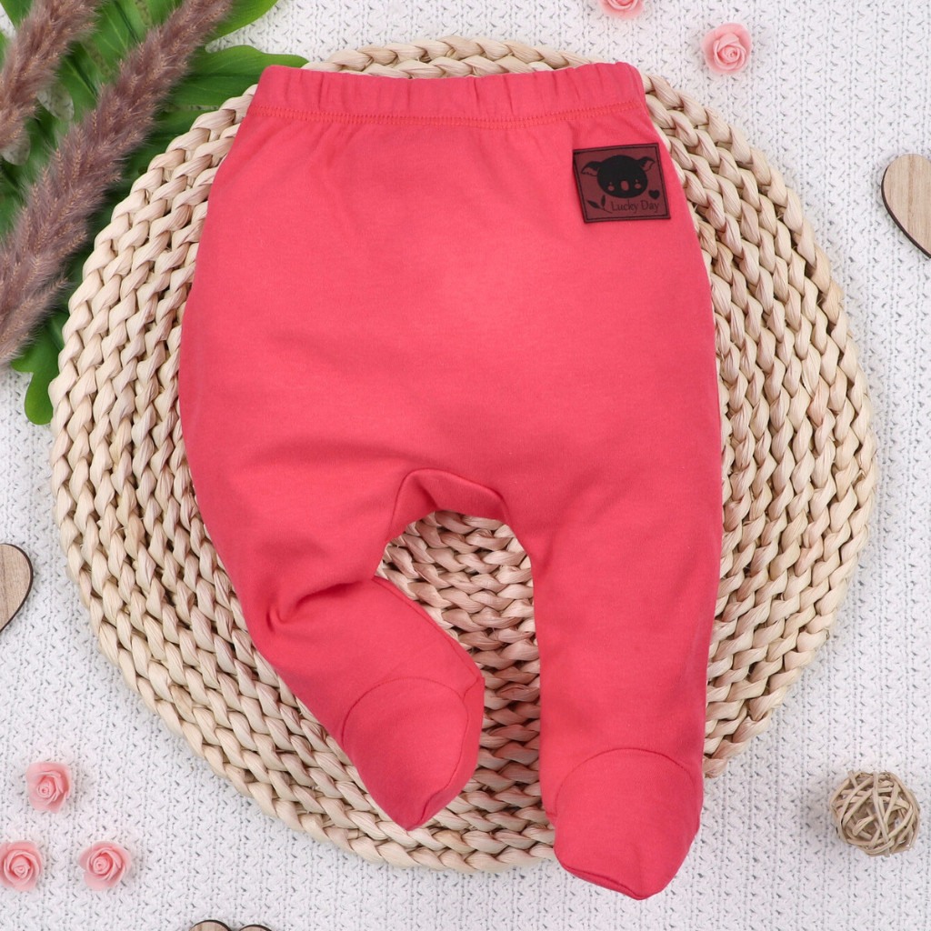 Ez a modell hagyományos, normál derékmagasságú nadrággal készült. A rugalmas gumis derékrész jól illeszkedik, nem szorít, ugyanakkor stabilan a helyén tartja a nadrágot. A lábfejes kialakítás gondoskodik arról, hogy a baba lába mindig melegen maradjon.