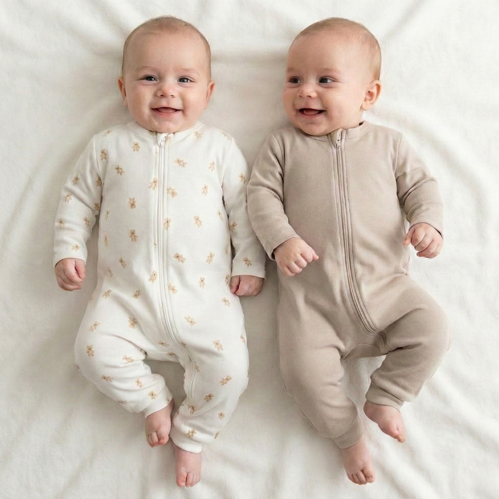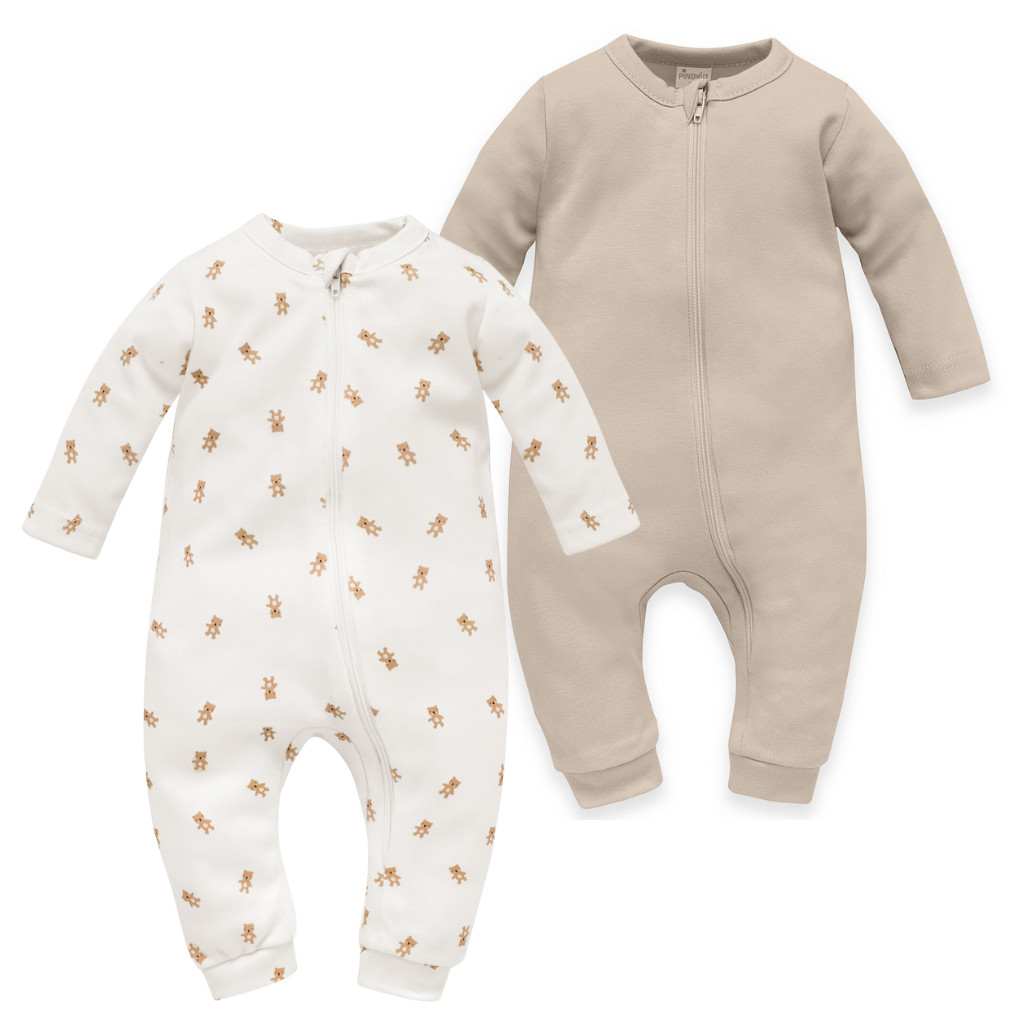 A rugdalózók szabása úgy lett kialakítva, hogy kényelmesen kövesse a baba mozgását, ne szorítson és ne csavarodjon el alvás vagy mozgás közben sem. A szellőző pamutanyag kíméletes a baba érzékeny bőréhez, ezért a szett kiváló választás újszülött kortól, mindennapi használatra. A cipzár a teljes elülső részen fut végig, így az öltöztetés gyors és kíméletes, a lábfej nélküli megoldás pedig különösen praktikus, amikor a baba már sokat mozog, mászik vagy lépeget. A két különböző megjelenésű darab jól kombinálható más ruhákkal, így a szett a praktikus, minőségi babaruházat sokoldalúan kihasználható része lehet. A természetes, nyugodt színek és a kedves maci motívum egyszerre teszik a rugdalózókat puha, szerethető és kényelmes választássá a mindennapokra, legyen szó alváshoz viselt ruháról vagy játékos napokra szánt öltözékről.
