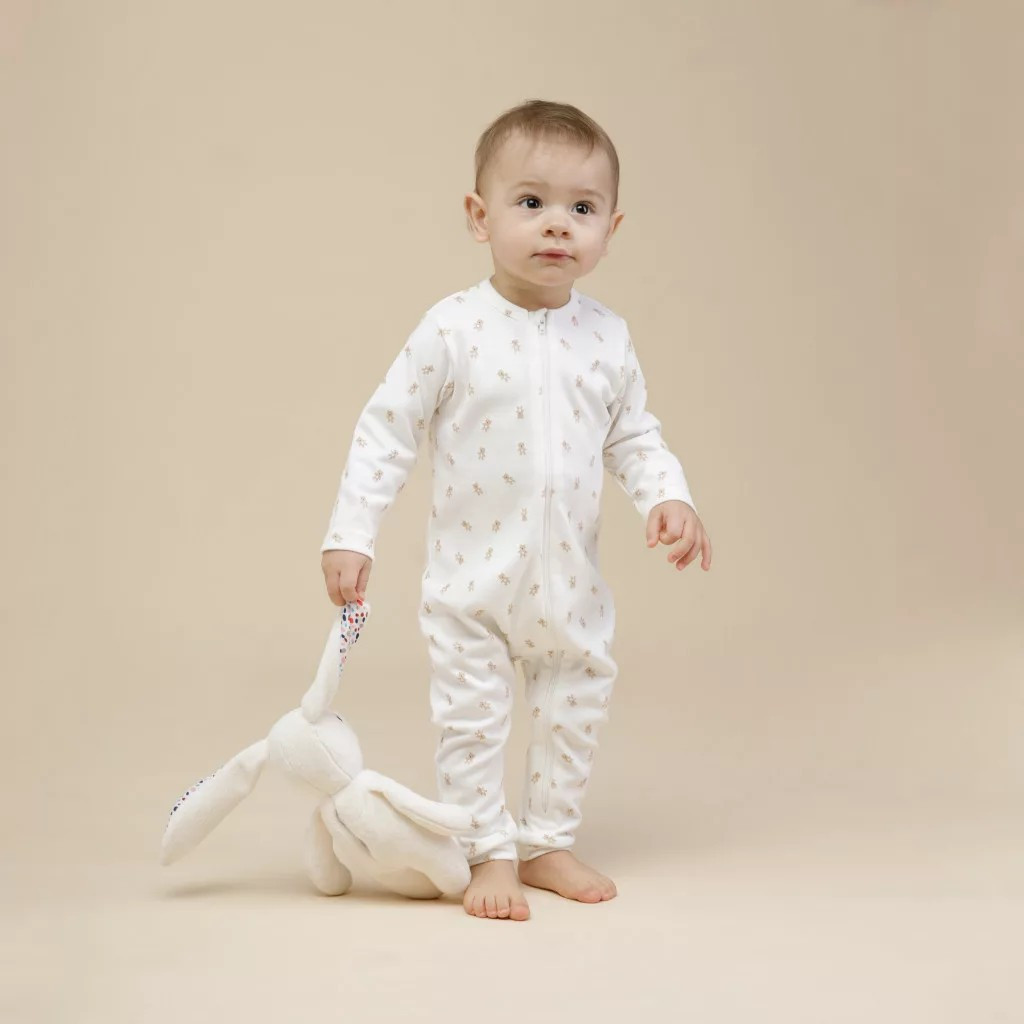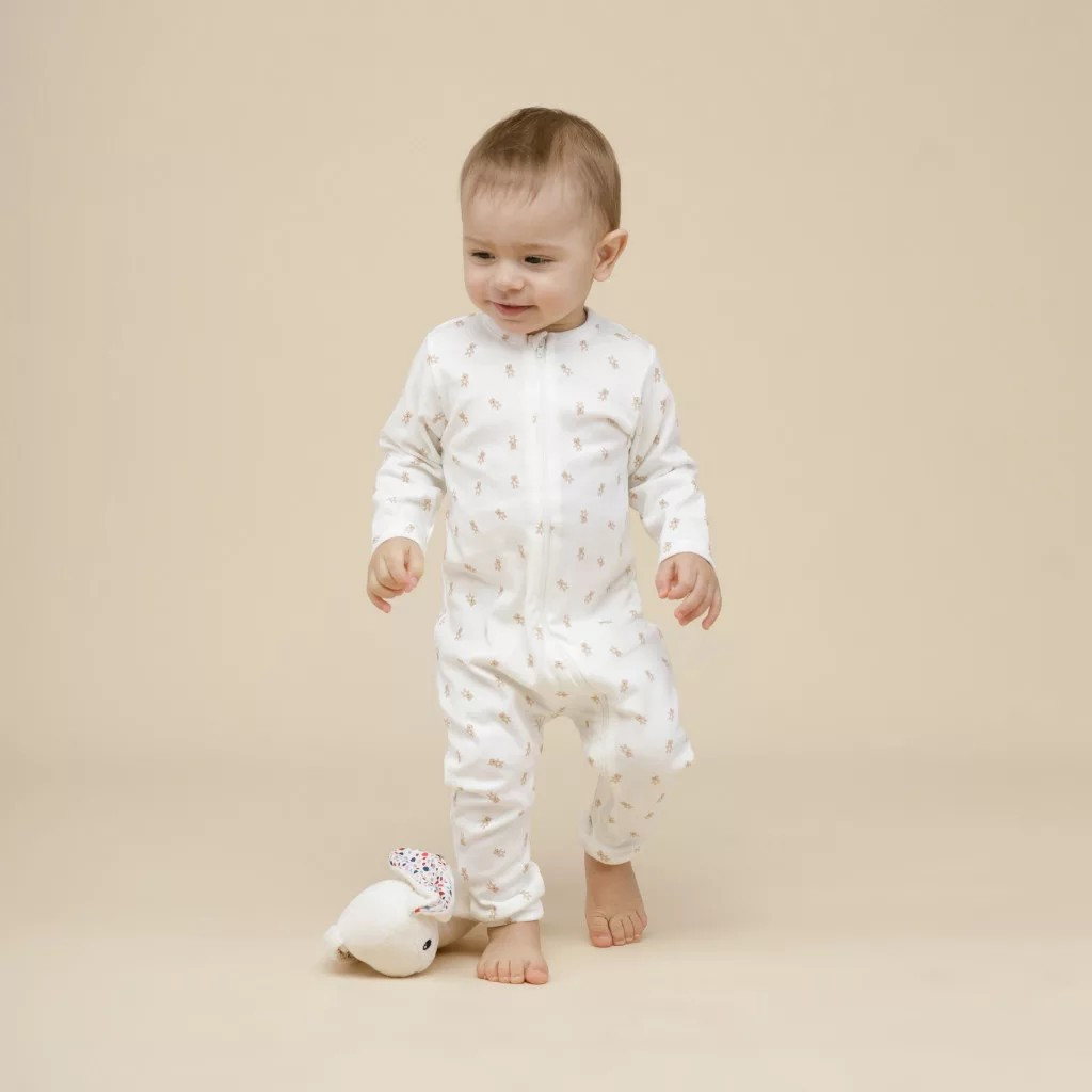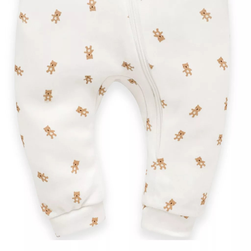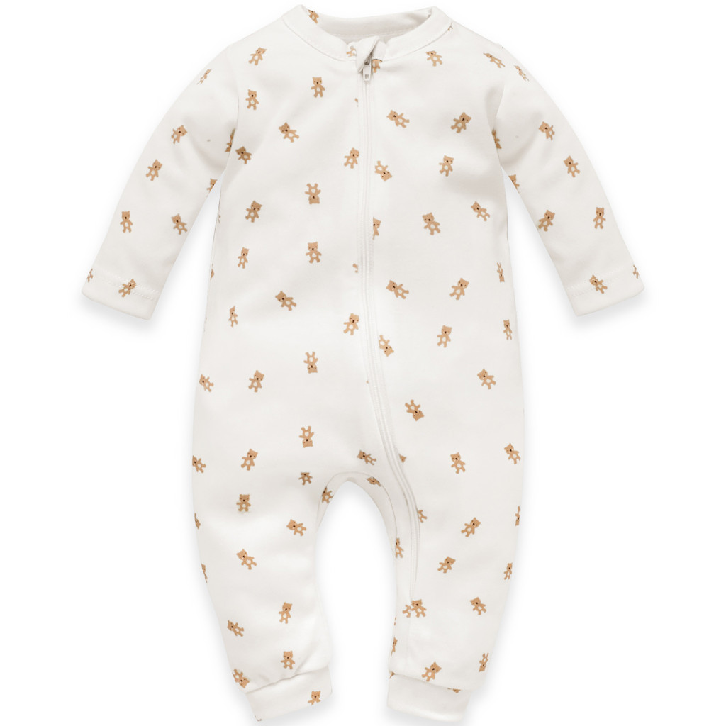 Kétrészes cipzáras uniszex baba rugdalózó szett – bézs és maci mintás écru, puha 100% pamut, lábfej nélküli fazon
