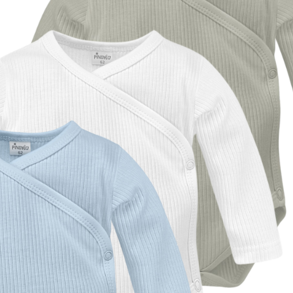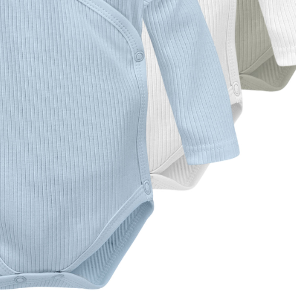 - 3 db hosszú ujjú, átlapolós, prémium minőségű, 100% pamut anyagból készült bordázott baba body kék, fehér és szürke színekben