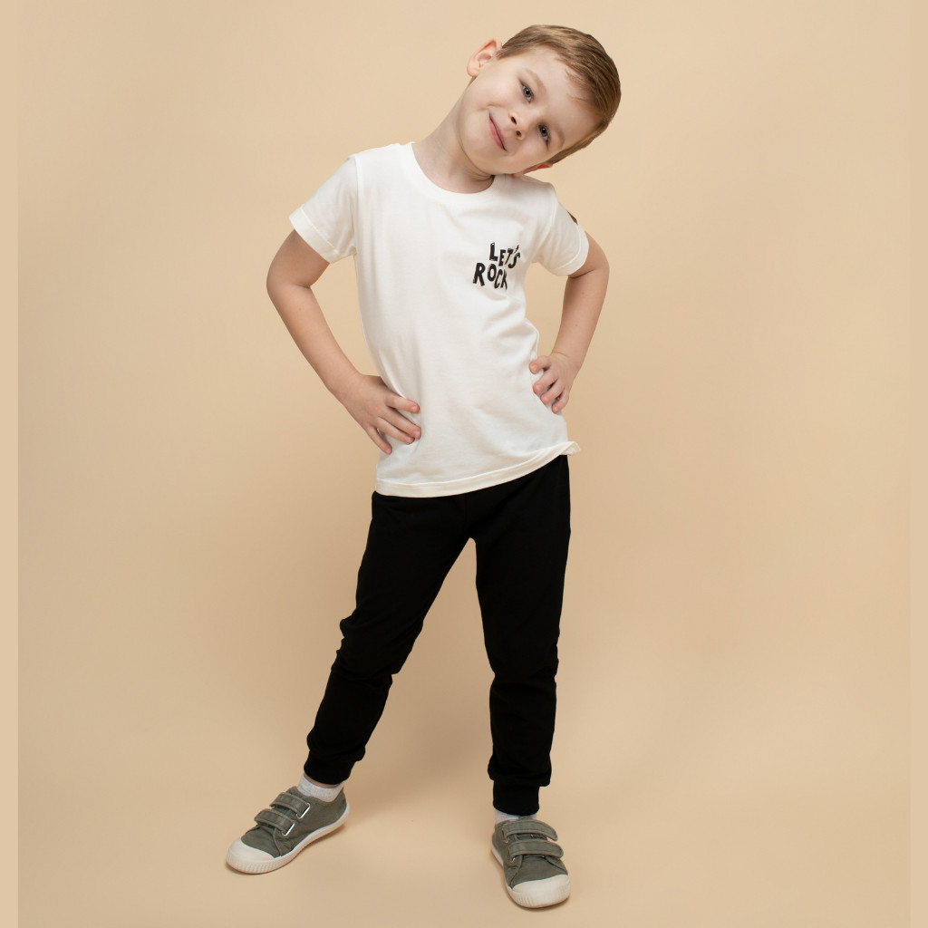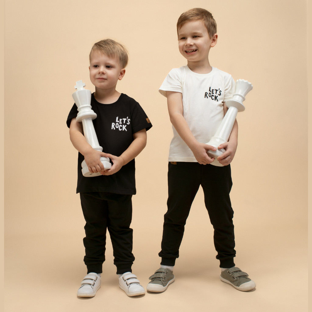 Ez a fekete kisfiú kétrészes együttes ideális választás a mindennapi viselethez. A „Let’s Rock” feliratos rövid ujjú póló és a kényelmes leggings sportos, modern megjelenést biztosít, miközben maximális komfortot nyújt játék, séta vagy óvodai programok során.