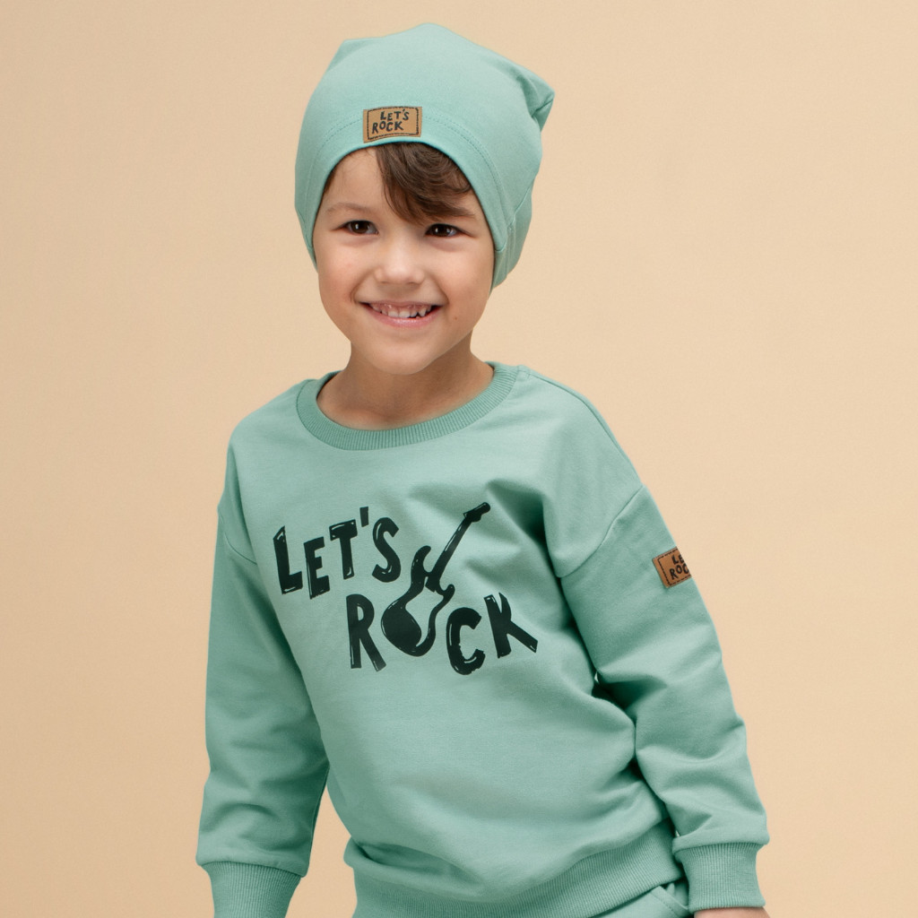Ez a mentazöld kisfiú háromrészes együttes tökéletes választás aktív hétköznapokra. A pulóver, nadrág és sapka harmonikus kombinációja sportos, modern megjelenést biztosít, miközben maximális kényelmet nyújt játék, séta vagy óvodai programok során. A „Let’s Rock” mintával díszített pulóver vidám, karakteres stílust ad az összeállításnak.