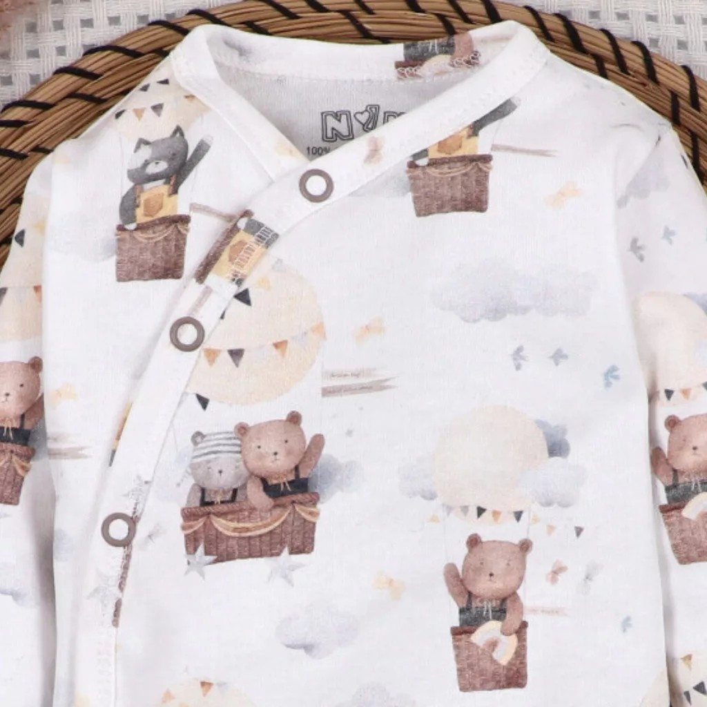 A Nini Balloon Friends kétrészes együttes tökéletes választás az első hónapokra: a puha, organikus pamut body és a kényelmes lábfejes nadrág együtt biztosítják a baba számára a maximális komfortot. Az átlapolós body kialakítás megkönnyíti az öltöztetést, míg a kedves macis minta igazán szerethetővé teszi ezt a szettet.