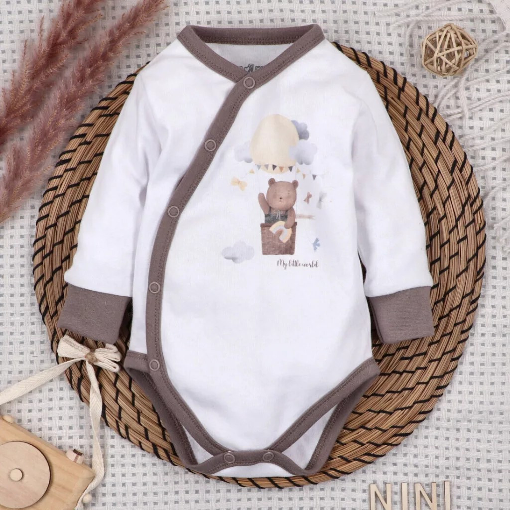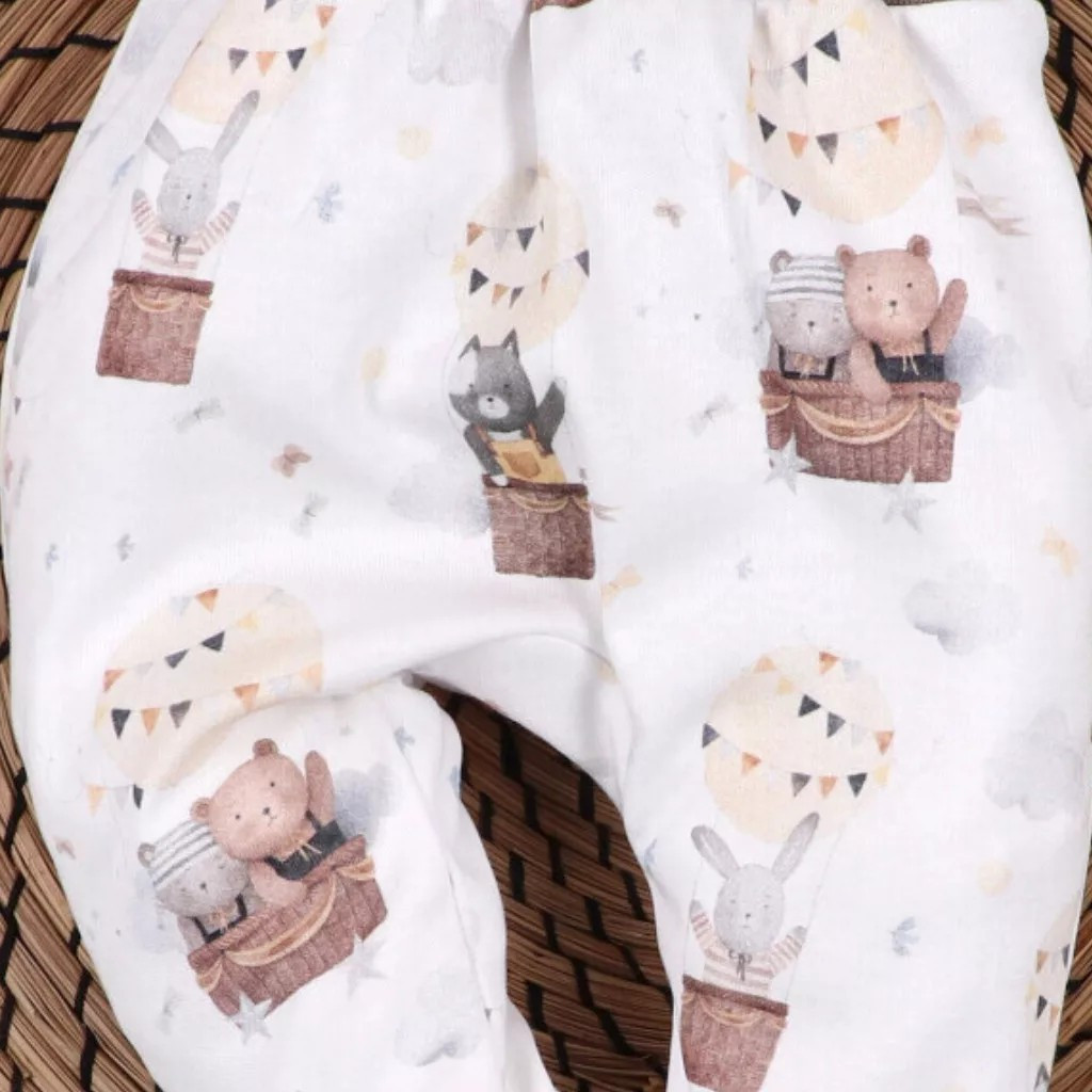Ez a NINI Balloon Friends kétrészes baba együttes egy átlapolós bodyból és egy lábfejes nadrágból áll, így ideális választás már az első pillanatoktól. Kiváló hazahozós szett, de ugyanilyen jól megállja a helyét egy kényelmes, mindennapi újszülött szettként is. A hőlégballonban utazó kis állatokkal díszített minta különleges, mégis finom megjelenést ad.