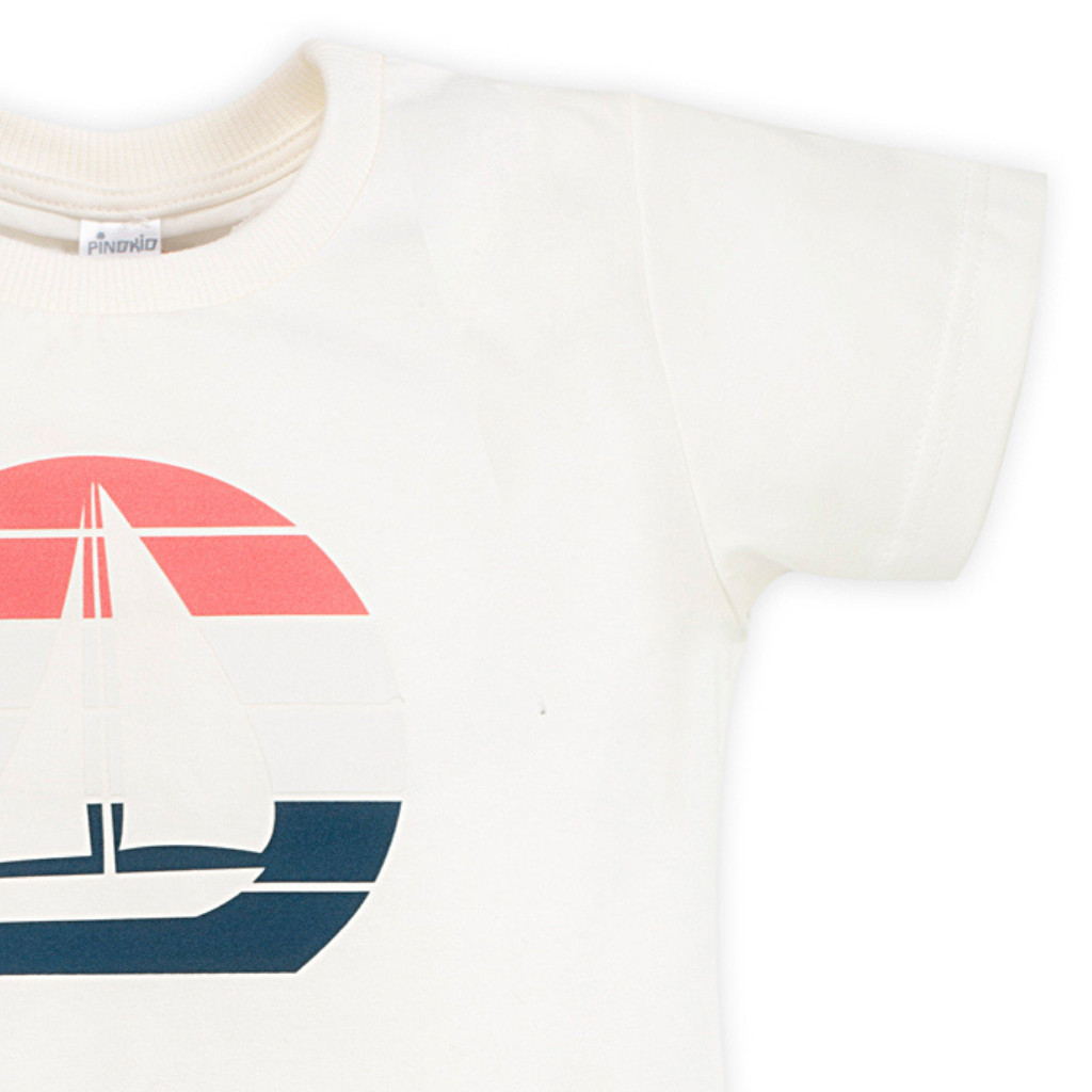 Ez a kisfiú kétrészes együttes tökéletes választás aktív hétköznapokra. A rövid ujjú póló és a rugalmas leggings harmonikus kombinációja kényelmes viseletet biztosít játék, séta vagy óvodai programok során. A pólón található hajós minta vidám, gyerekbarát megjelenést ad az összeállításnak.